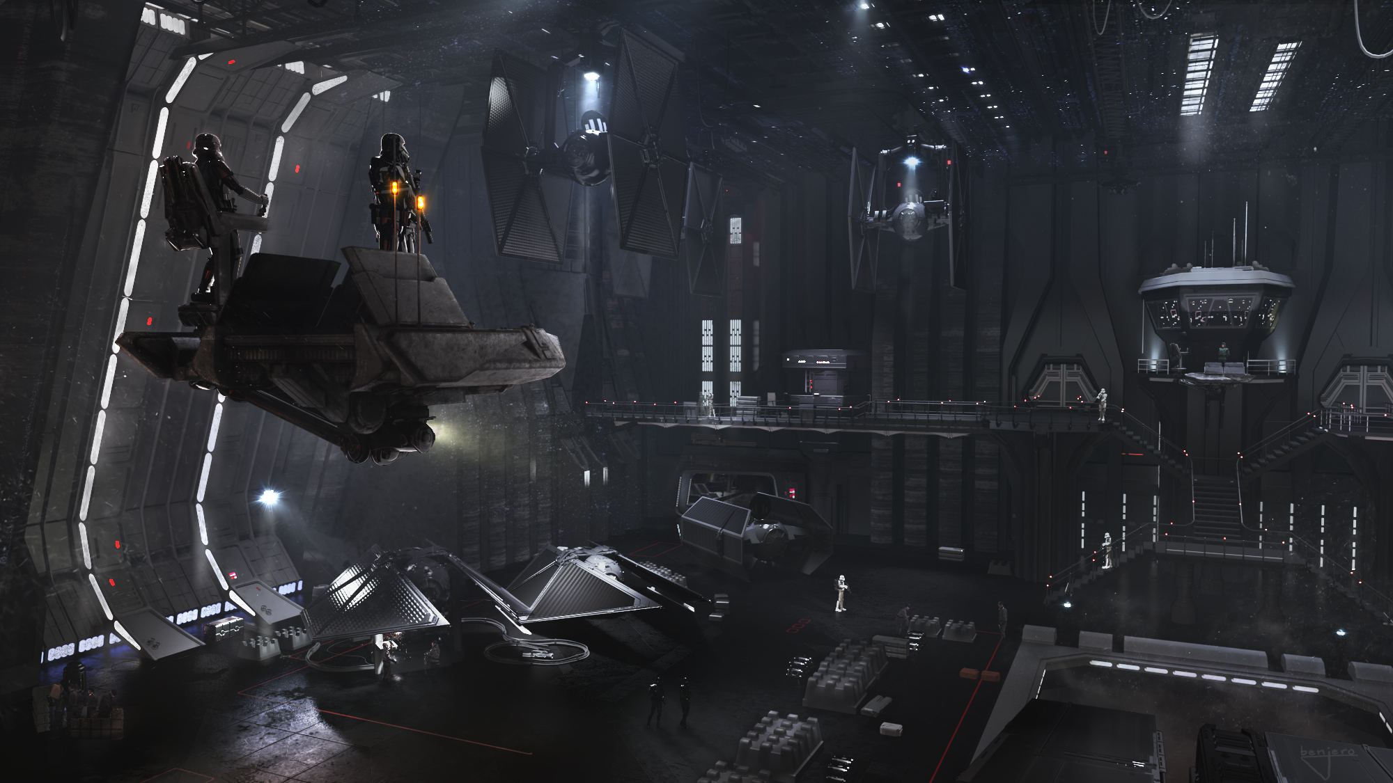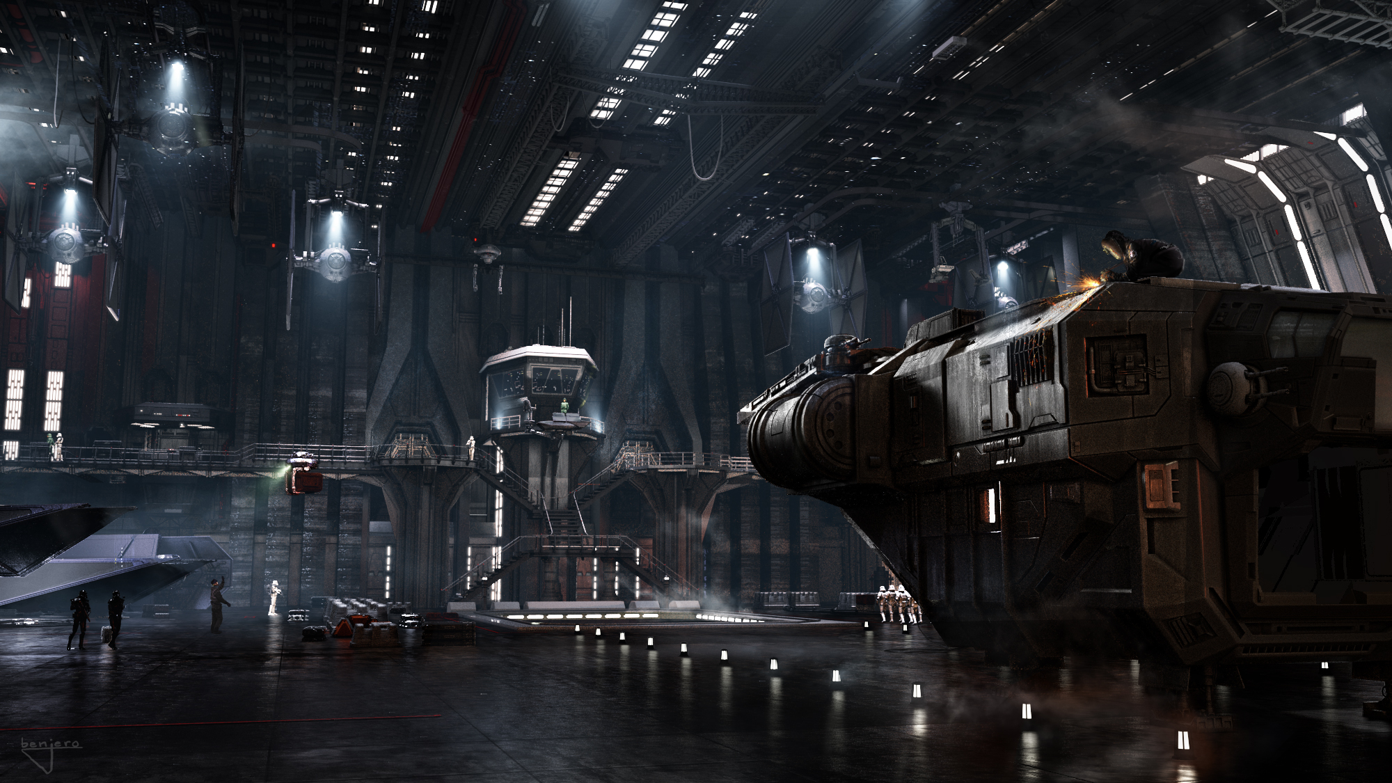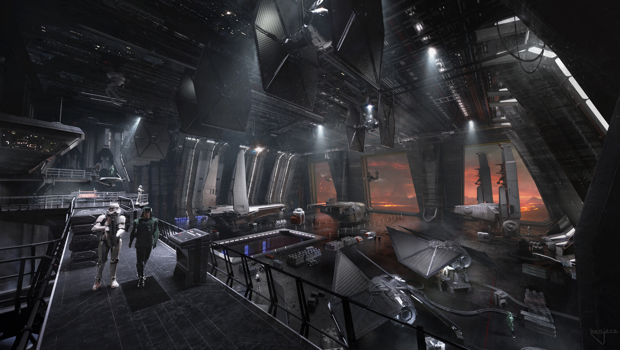 The following are design frames from the hangar, where we first arrive, and also where the final battle takes place.
